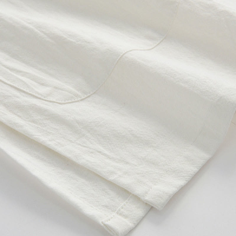 Chinese Frog-Button Linen shirt showcases pure white cotton and linen fabric, designed with traditional frog-button closures and practical pockets. This shirt emphasizes cultural elegance and simplicity with its classic design. The white color represents purity and calm, making it a timeless piece for those who appreciate heritage craftsmanship and understated sophistication. 💕
