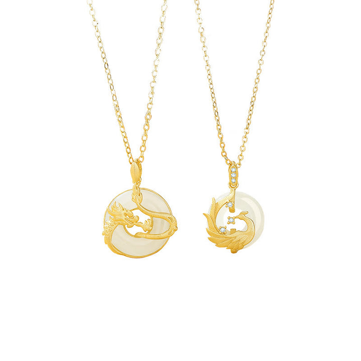Buddha Stones 925 Sterling Silver Year of the Dragon Hetian Jade Golden Dragon Phoenix Peace Buckle Luck Necklace Pendant