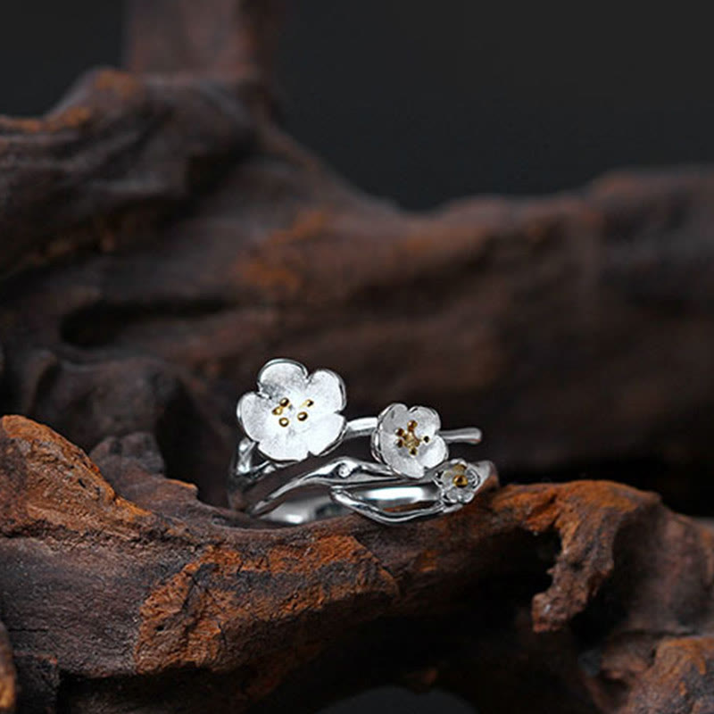 Sterling Silver Plum Blossom Ring features a beautifully crafted design inspired by plum blossoms, symbolizing resilience and balance. Made from high-quality 925 sterling silver, this ring embodies purity and spiritual growth. Its elegant structure serves as a reminder of the strength found in harmony, making it a meaningful piece for those seeking stability and a deeper connection to their emotional well-being.💕