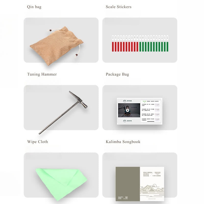 • Package Included: Kalimba*1, Kalimba Songbook*1, Tuning Hammer*1, Note Sticker*1, Cleaning Cloth*1, Storage Bag*1