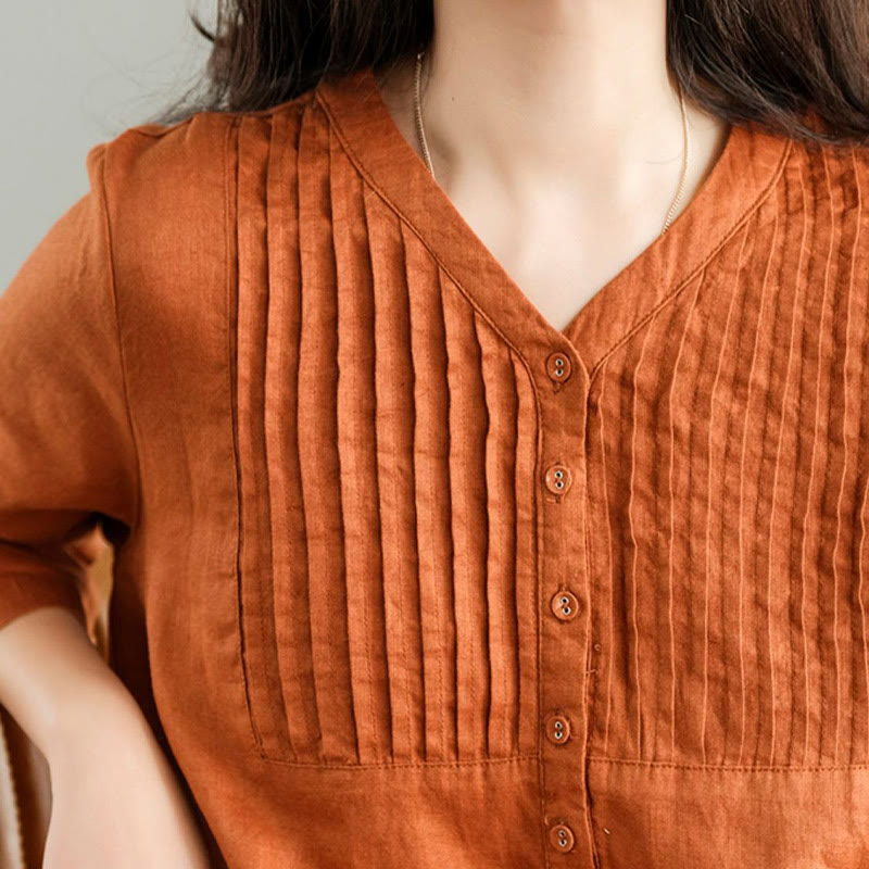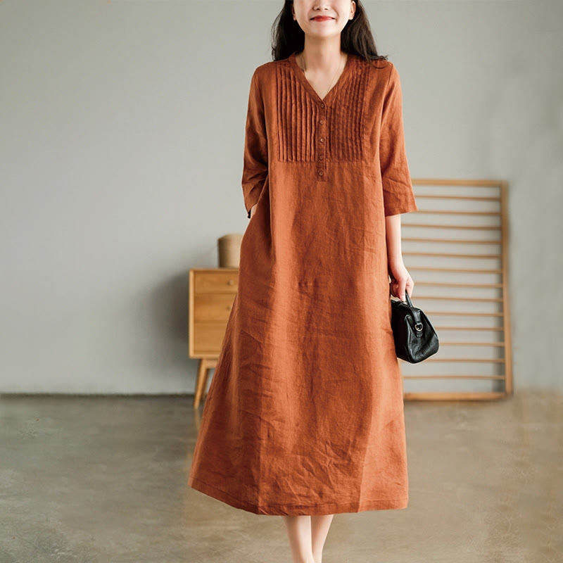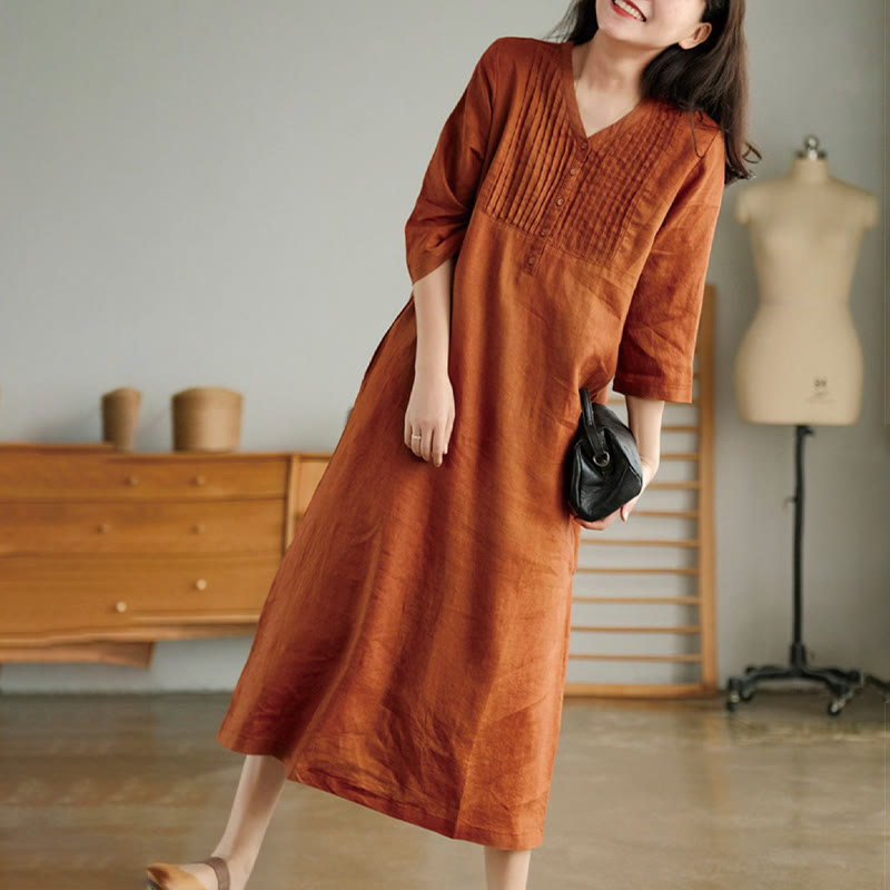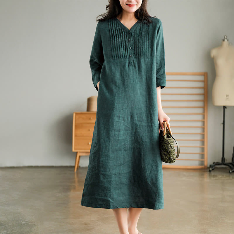 Buddha Stones Casual Plain Accordion Pleats V-neck Half Sleeve Design Midi Dress With Pockets