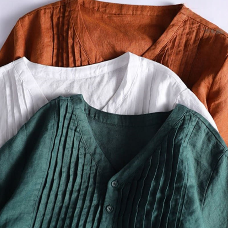 Buddha Stones Casual Plain Accordion Pleats V-neck Half Sleeve Design Midi Dress With Pockets - image 14