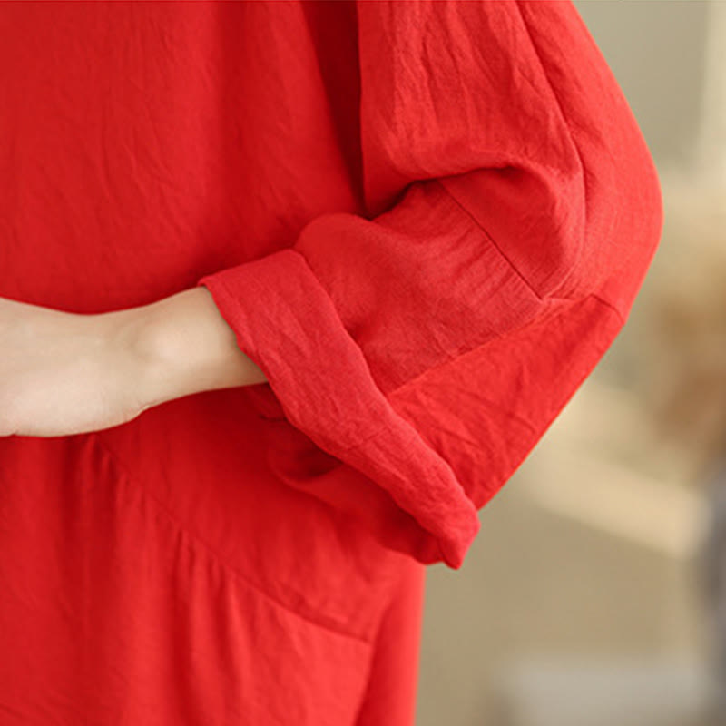 Buddha Stones Fall Pure Color V-Neck Long Sleeve Cotton Midi Dress - Red - US4-12,UK/AU8-18,EU36-46(F) - image 7