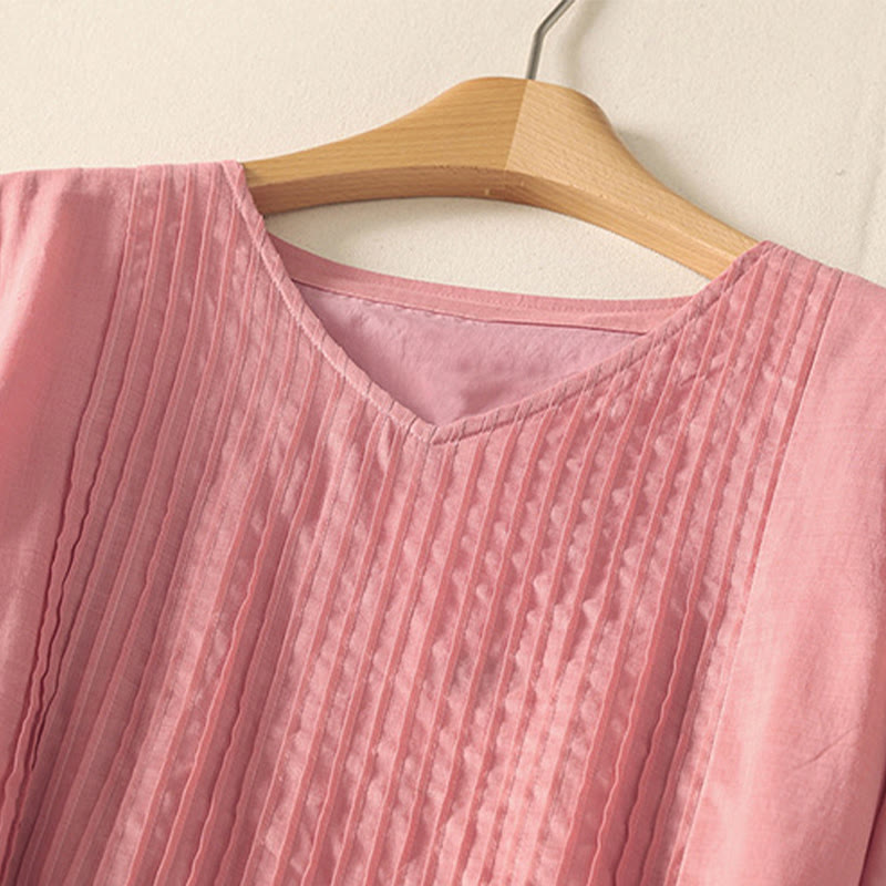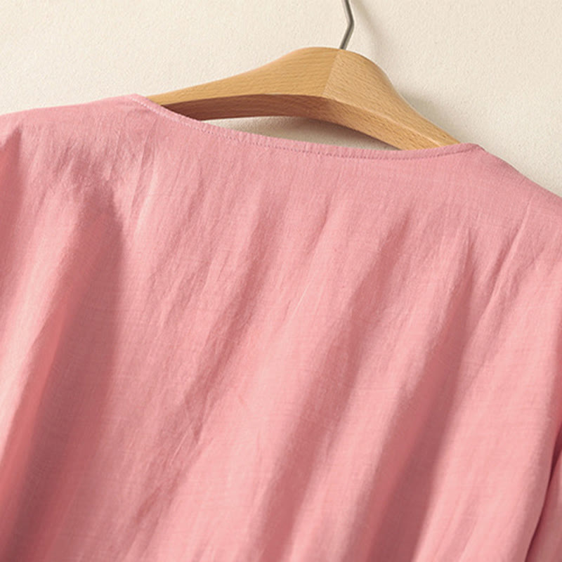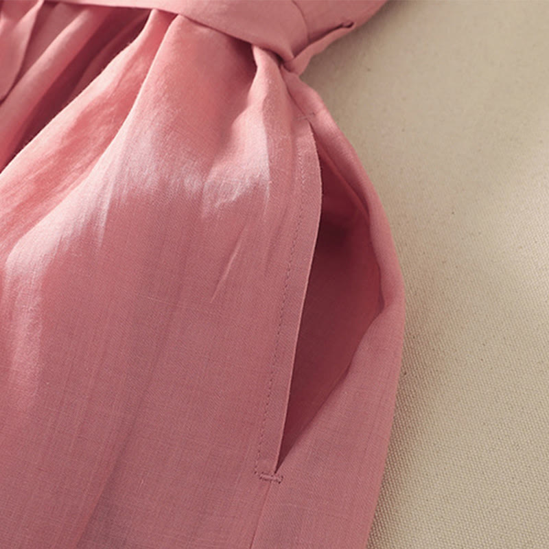 Buddha Stones Summer Short Sleeve Pleats Lace-up Cotton Linen Women's Midi Dress With Pockets