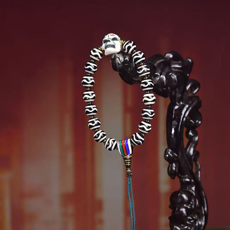 Dzi bead (Tib. གཟི།; pronounced "zee"; alternative spelling: gzi) is a type of stone bead of uncertain origin worn as part of a necklace and sometimes as a bracelet. Dzi beads are precious jewelry from Tibetan culture which is generally prized as protective amulets,these beads are believed to attract local protectors, dharmapalas or deities or maybe beneficial ghosts, ancestors or even bodhisattvas. Because of this, dzi beads are always treated with respect in Tibetan culture. Nine-Eye Dzi Bead is the symbol of The Nine Planets, It includes the activity of the Universe and the wisdom of the humanity. Nine-eyed beads is the most popular of all Dzis, brings all kinds of luck and blessings; protection, good health, purify negative energy expand intelligence and wisdom.It helps the investors with the successful development of new ideas in rolling in wealth.