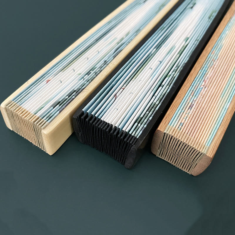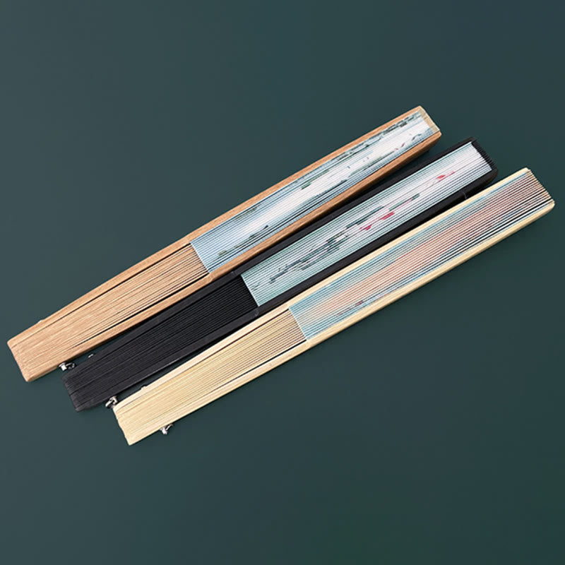 Buddha Stones Retro Lotus Flower Leaf Mountain Lake Handheld Folding Fan With Bamboo Frames - Peach Blossom Mountain Landscape - Black Bamboo Frames - image 20