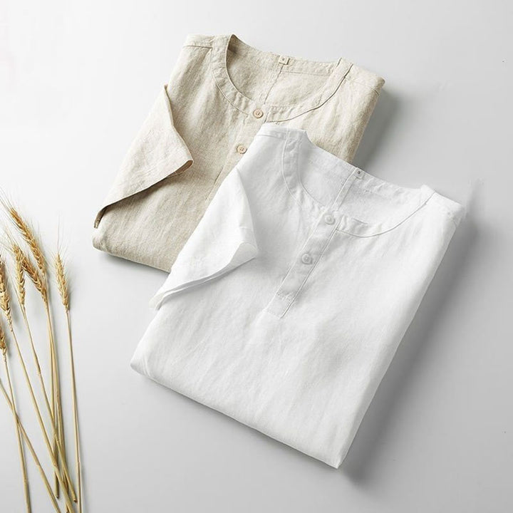 Buddha Stones Summer Men's Solid Color Button Short Sleeve Cotton Linen Shirt