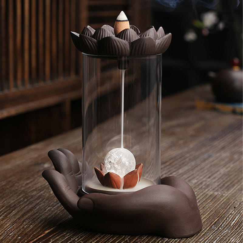 Buddha Stones Buddha Hand Lotus Enlightenment LED Light Purple Clay Ceramic Incense Burner Decoration