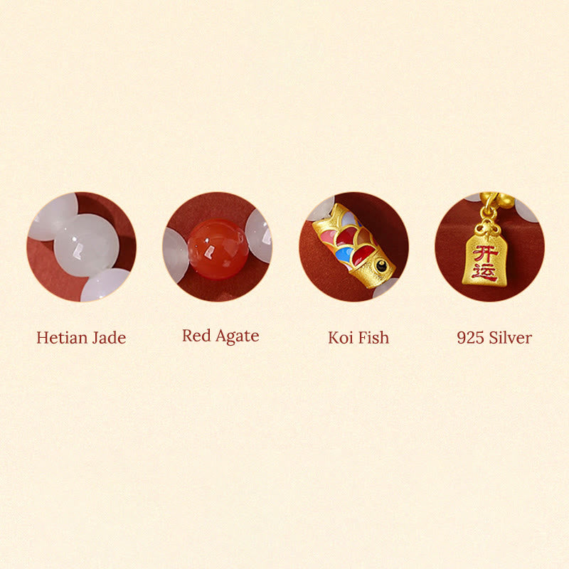 Buddha Stones 925 Sterling Silver Hetian White Jade Red Agate Koi Fish Luck Happiness Bracelet