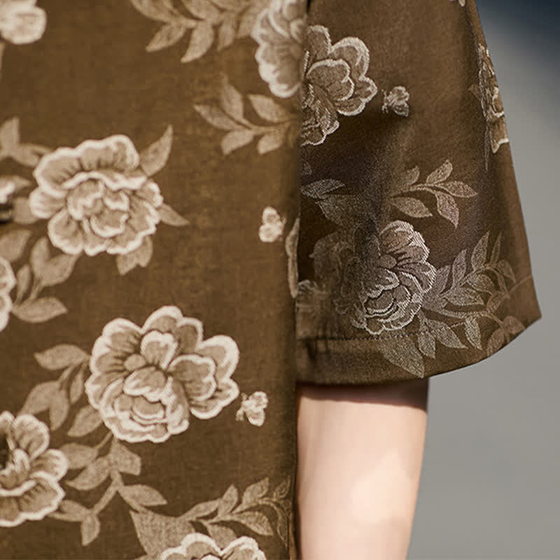 Buddha Stones Retro Frog Buttons Mandarin Collar Floral Jacquard Men's Short Sleeve Shirt