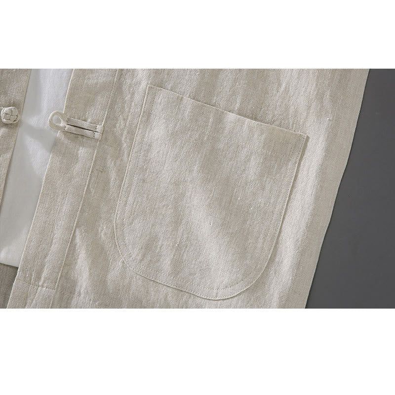 Buddha Stones Vintage Plain Tang Suit Chinese Frog-Button Cotton Linen Men's Shirt With Pockets