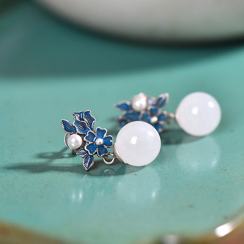 Buddha Stones White Jade 925 Sterling Silver Pearl Flower Blessing Necklace Pendant Ring Earrings - Silver - Earrings - image 22