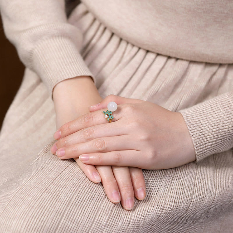 Buddha Stones White Jade 925 Sterling Silver Pearl Flower Blessing Necklace Pendant Ring Earrings - Gold - Ring - image 2