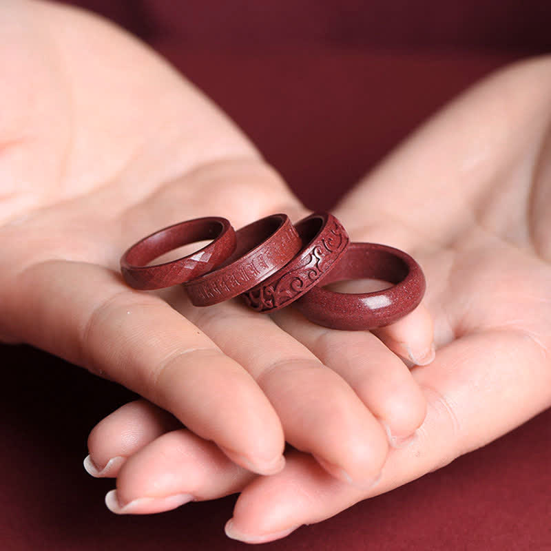 This unisex Cinnabar Om Mani Padme Hum Auspicious Clouds Blessing Ring is made of high-quality materials and has a positive meaning. It's known for its calming properties, improving wisdom, and keeping evil spirits at bay. Handmade with natural materials, each ring may have slight variations.