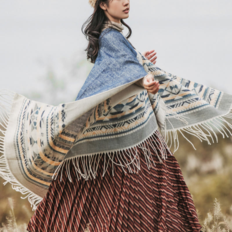 Buddha Stones Tibetan Geometric Rhombus Pattern Tassels Shawl Fall Winter Warm Cozy Scarf Wrap