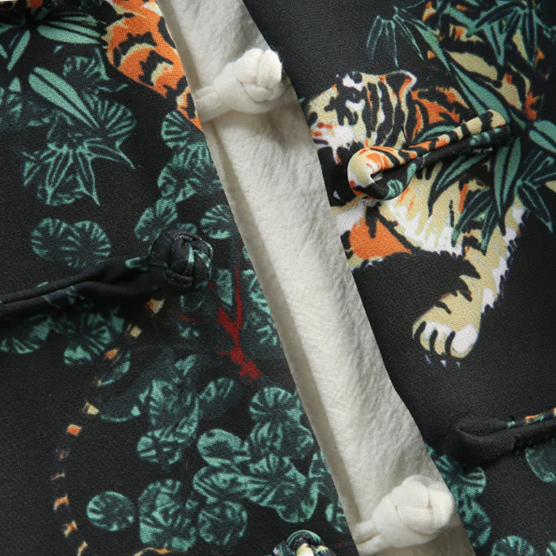 Forest Tiger Jacket Shirt showcases a bold embroidered tiger amidst a forest motif, symbolizing strength and vitality. Made from high-quality fabric with a vibrant red cuff and traditional frog-button closure, it offers comfort and cultural significance. Complete with practical pockets, this Tang Suit-inspired design is perfect for celebrating Chinese New Year with elegance and meaning.💕