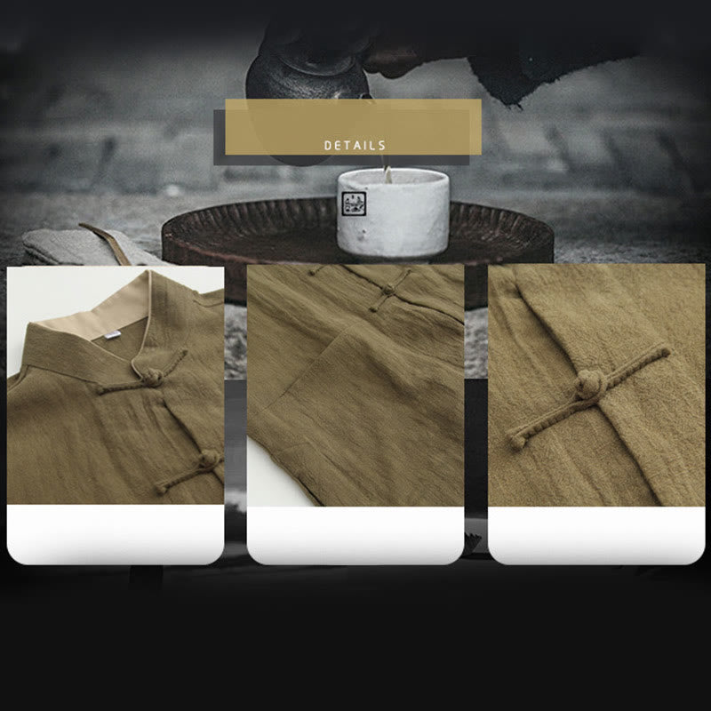Buddha Stones Tang Frog-Button Long Sleeve Shirt Cotton Linen Men's Clothing - DarkKhaki - US/UK/AU44,EU54 (4XL) - image 0