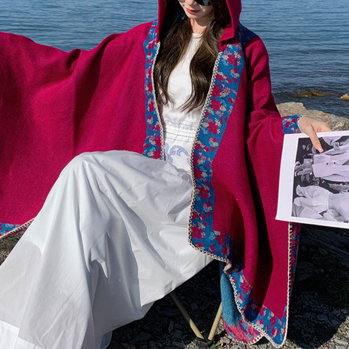 Buddha Stones Tibetan Shawl Border Small Floral Flower Hooded Cloak Winter Cozy Travel Scarf Wrap
