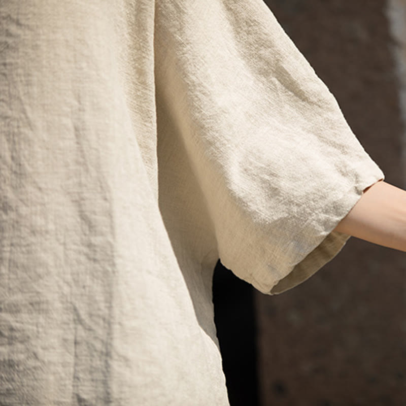 Half Sleeve Linen Cotton T-shirt Tee offers a comfortable blend of ramie and cotton for a breathable fit. Featuring a round neckline with a single button closure, this half-sleeve tee embodies simplicity and ease. The natural fibers ensure durability and softness, making it an ideal choice for relaxation and tranquility, perfect for mindful moments.💕