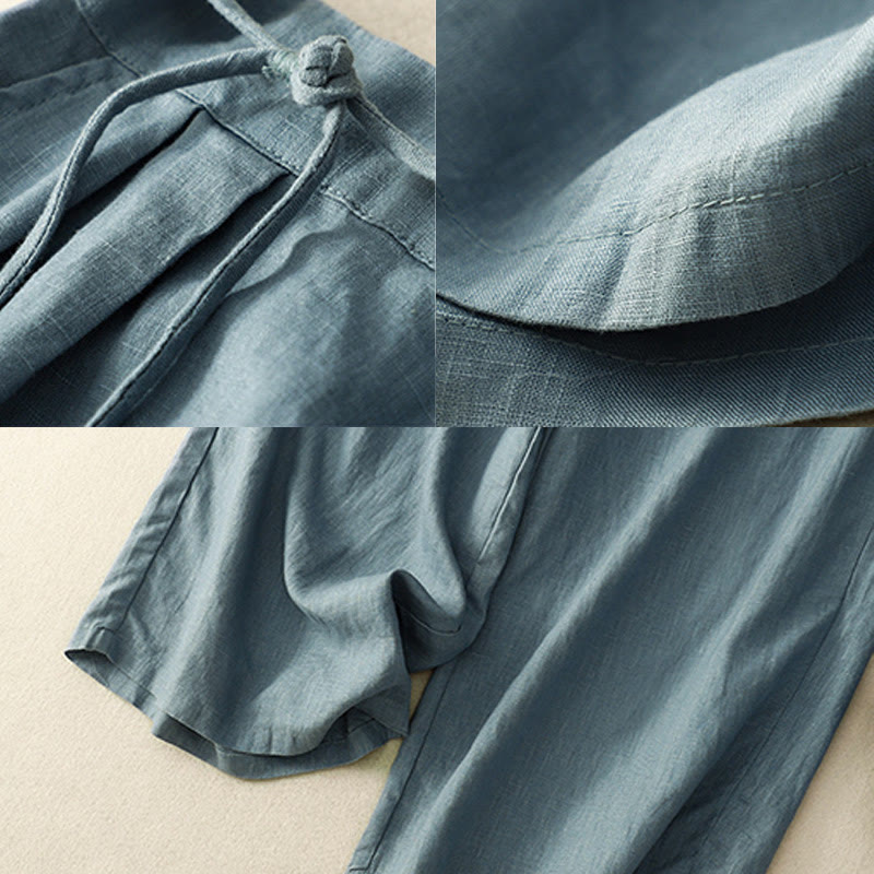 Buddha Stones Spring Casual Solid Color Drawstring Design Women's Cotton Linen 7-8 Length Wide Leg Pants With Pockets