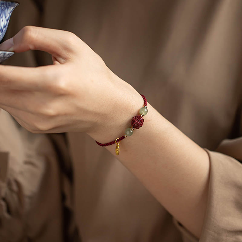 Buddha Stones Natural Cinnabar Chinese Zodiac Hetian Jade Fu Character Luck Rope Bracelet Bracelet BS 4