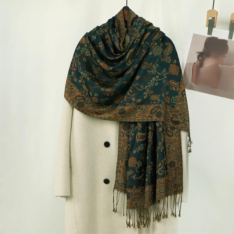 Buddha Stones Spring Dark Green Cashew Flower Floral Leaf Pattern Tassel Soft Scarf Shawl